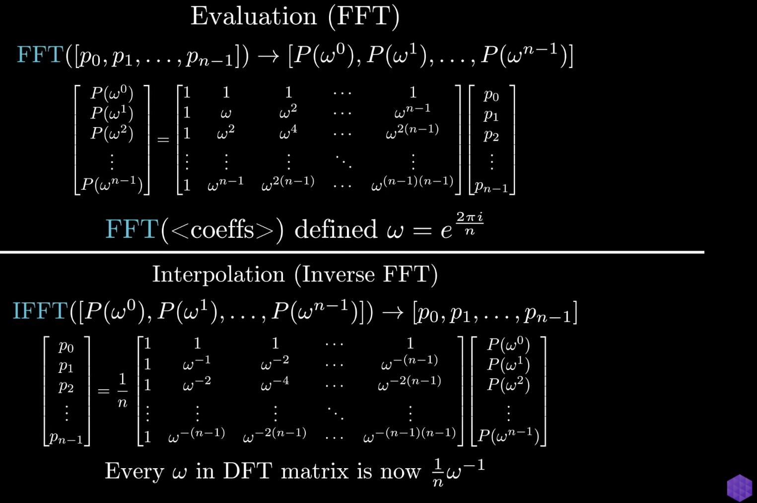 * 다항식을 행렬로 표현했을 때, xk = w^k, w = 2^(2πi/n)을 이용, Discrete Fourier Transform (DFT) Matrix를 구한다.
